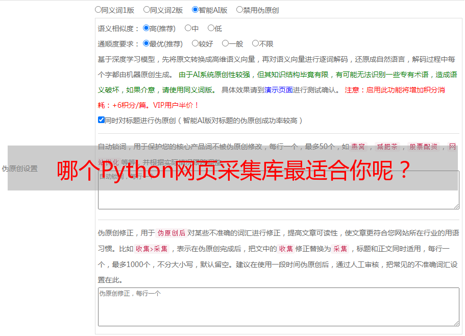 综上所述,在选择Python网页采集库时,需要根据自己实际需求来选择最适合自己的库。如果需要进行*敏*感*词*数据爬取,并且对执行速度和效率有较高要求,则建议选择Scrapy或者Requests;如果只需要对少量数据进行简单处理,则可以选择BeautifulSoup或者PyQuery;如果需要模拟浏览器行为并与之交互,则建议选择Selenium。
