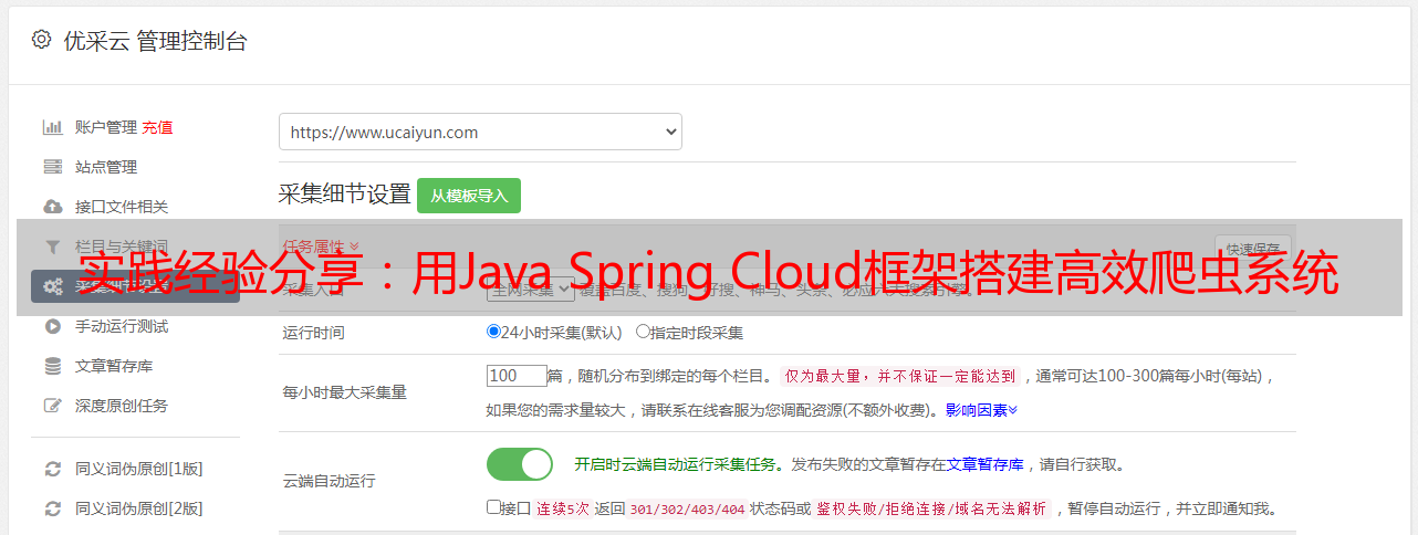本文介绍了使用 Java Spring Cloud 框架搭建爬虫系统的步骤,并分享了实践经验。希望这些内容能够对正在进行数据采集工作的读者有所帮助。如果您需要更多关于爬虫和数据采集方面的帮助,请访问优采云官网(www.ucaiyun.com)。