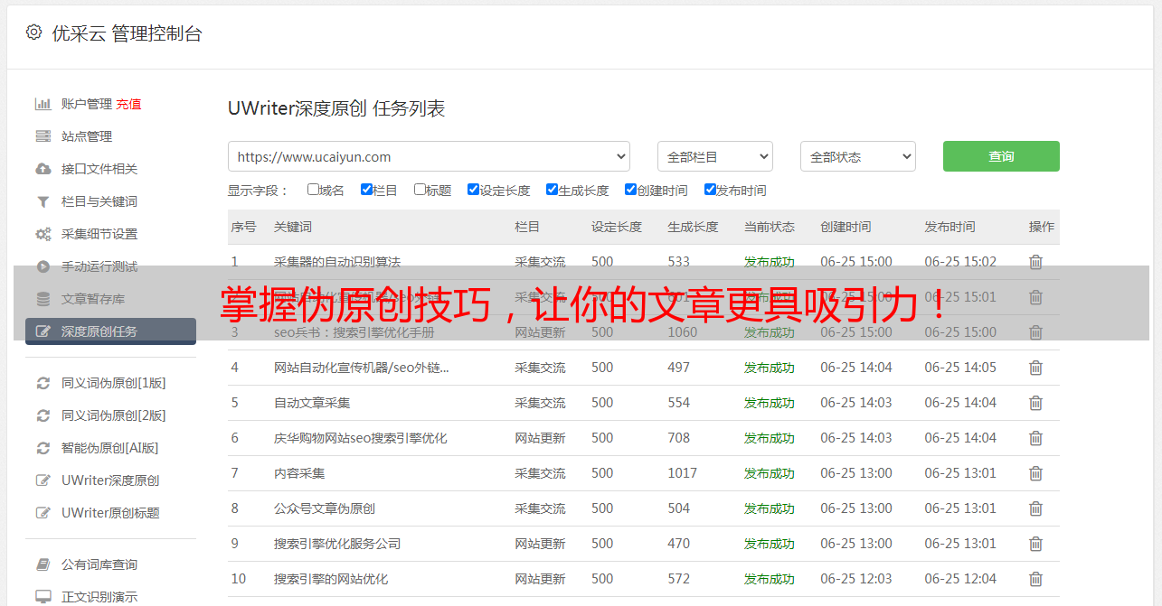 现在市面上有很多专业的伪原创工具可以帮助你快速生产文章。比如优采云(www.ucaiyun.com),它提供了一系列SEO优化工具和高质量的素材库,让你轻松地生成优秀的伪原创文章。