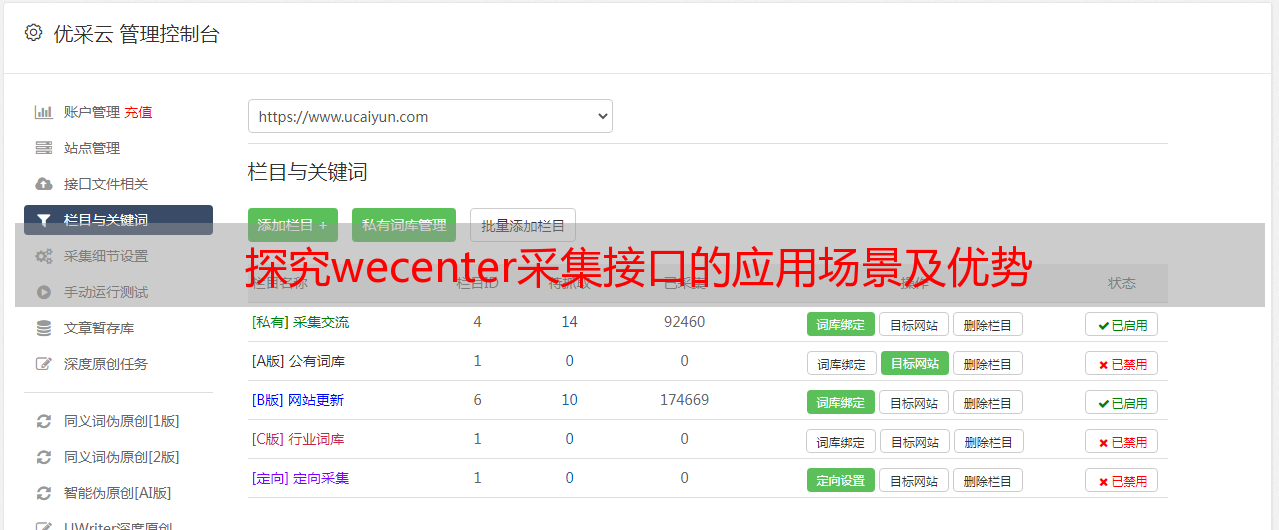 wecenter采集接口是一种基于HTTP协议的API接口,可以实现对目标网站的内容进行快速、准确、高效的采集。它支持多种数据格式输出,包括JSON、XML等,同时还提供了多种参数调节选项,如爬虫深度、每次返回数据量等。通过wecenter采集接口,你可以轻松地实现数据抓取和整合。