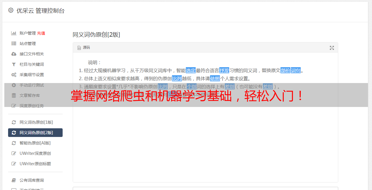 优采云 发布时间: 2023-03-03 12:15学习网络爬虫和机器学习是如今技术领域中必不可少的技能。网络爬虫是一种自动化工具,用于从互联网上获取数据,而机器学习则是一种人工智能技术,可以让计算机根据数据自动学习和改进。这两种技能之间存在着紧密的联系,掌握它们可以让你在数据分析、人工智能等领域获得更多的机会。