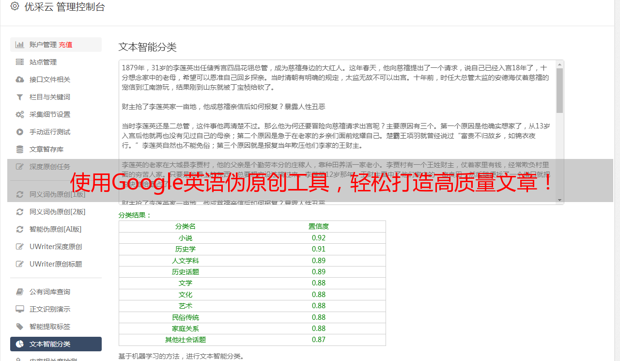 优采云 发布时间: 2023-03-03 19:12在当今的信息时代,网络上的内容创作越来越受到重视。然而,随着互联网上内容的爆炸式增长,很多人开始使用一些工具来快速生成文章,其中最为常见的就是伪原创软件。在这些软件中,Google英语伪原创无疑是最为出名的一款。那么,如何使用这款工具创造出高质量的文章呢?本文将从以下十个方面进行详细分析。