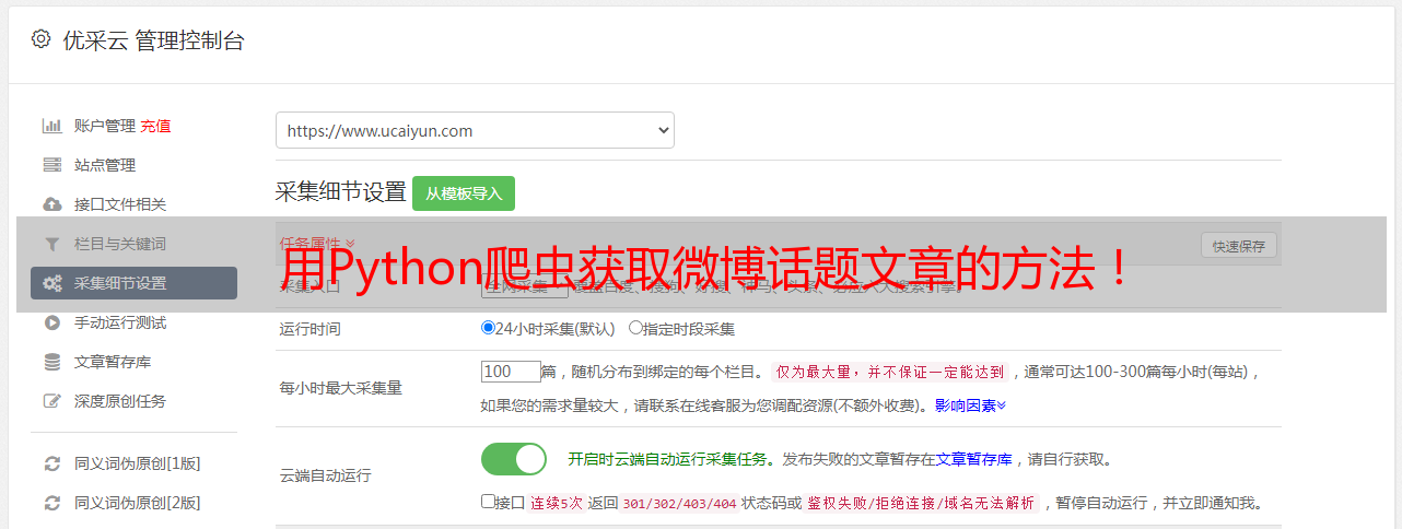 优采云 发布时间: 2023-03-03 19:12Python是一种强大的编程语言,可以帮助我们自动化许多重复性工作。其中,爬虫就是Python编程中十分重要的一环。在社交媒体上,微博是一个非常受欢迎的平台,每天都有成千上万的用户发布各种信息。如何通过Python爬虫来获取微博话题文章呢?本文将为您详细介绍。