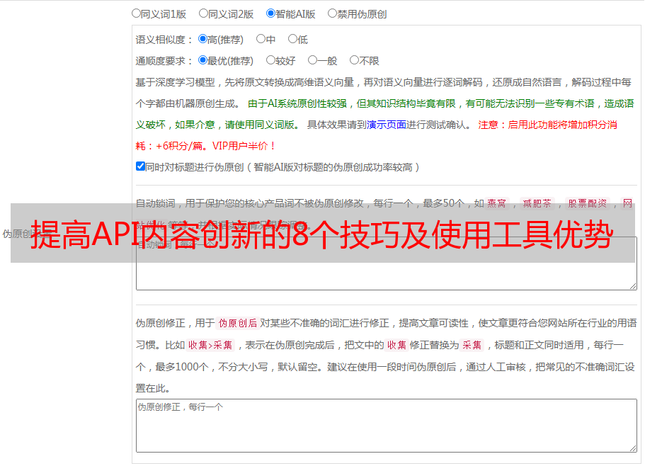 2.API伪原创工具生成出来的内容可能存在不符合读者阅读习惯或者传达不清楚等问题,在发布前要进行一定调整改善;