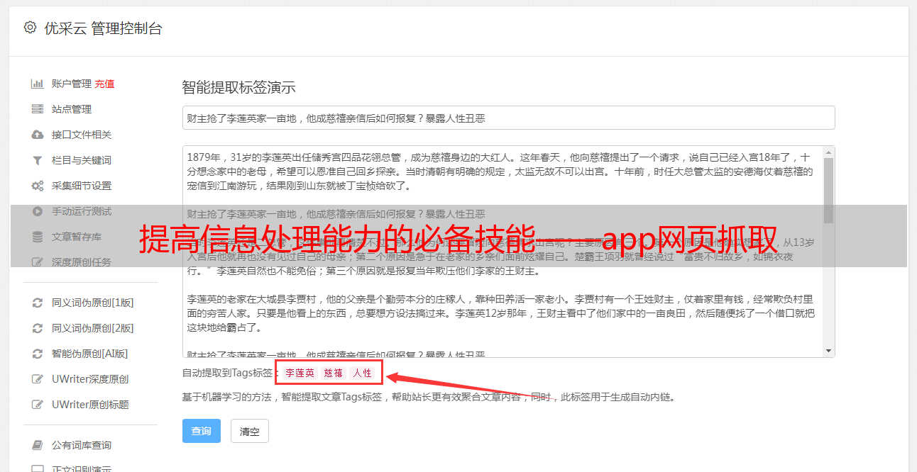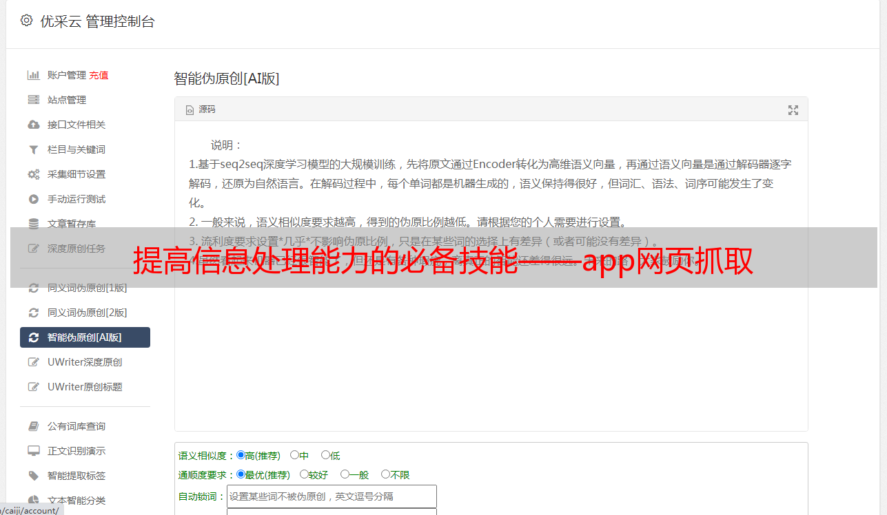 优采云 发布时间: 2023-03-03 21:12在当今信息化社会,互联网上的信息量已经无法估量。而如何在这个庞大的信息海洋中寻找到自己需要的内容,成为了现代人面临的难题。本文将介绍一种新的方式——app网页抓取,它可以帮助您快速高效地获取所需信息,并提高您的信息处理能力。
