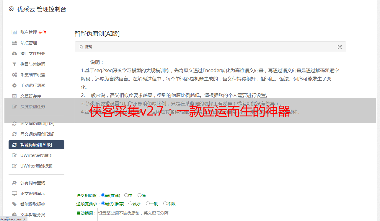 总之,“采集侠v2.7”是一款非常优秀的数据采集软件,在自媒体时代具有不可替代的地位。它不仅能够帮助个人或企业快速获取所需信息,并且还能够提高工作效率、降低成本。如果你还没有使用过这款神器,请赶紧试试吧!