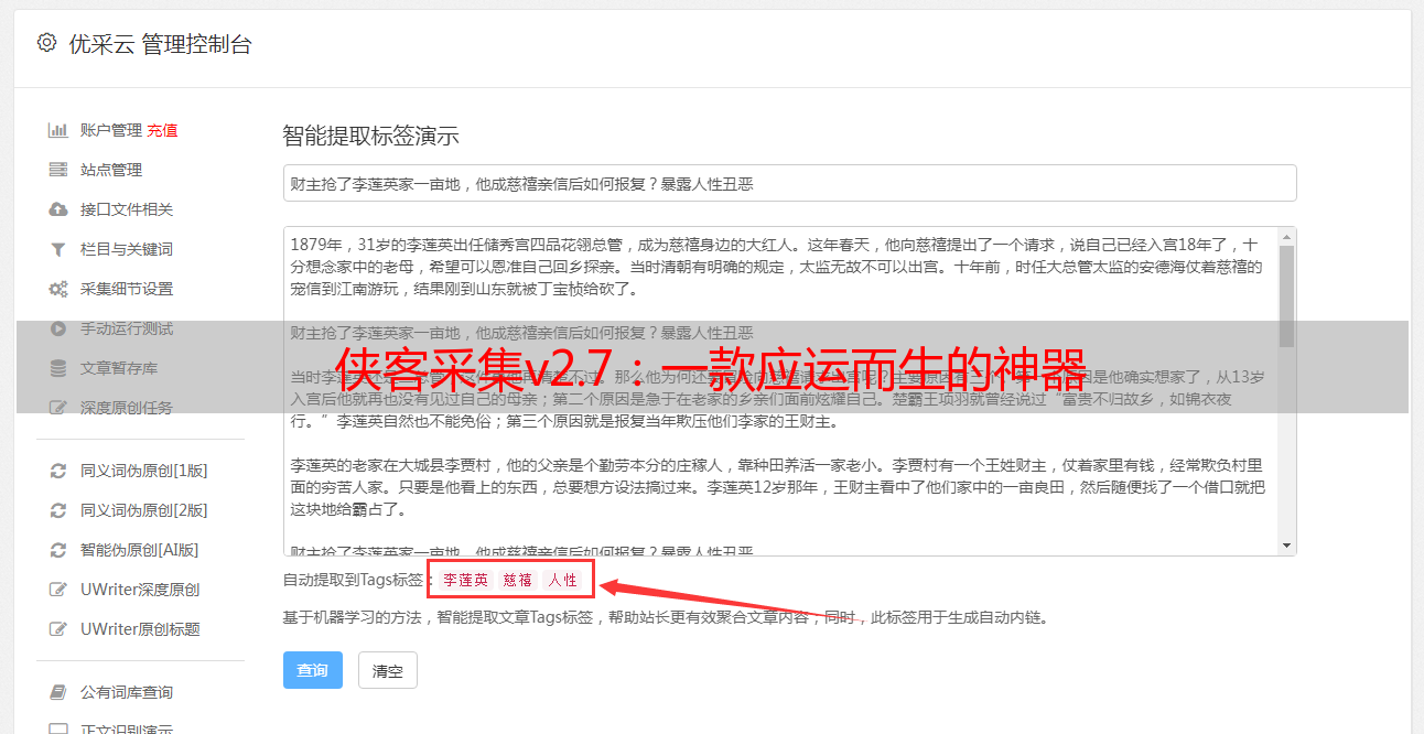 优采云 发布时间: 2023-03-04 04:06在当今信息化的社会,互联网已经成为人们获取信息的主要途径。而在这个大数据时代,如何快速、准确地采集信息成为了企业和个人必须面对的问题。于是,一款名为“采集侠v2.7”的软件应运而生,成为了自媒体人必备的神器。
