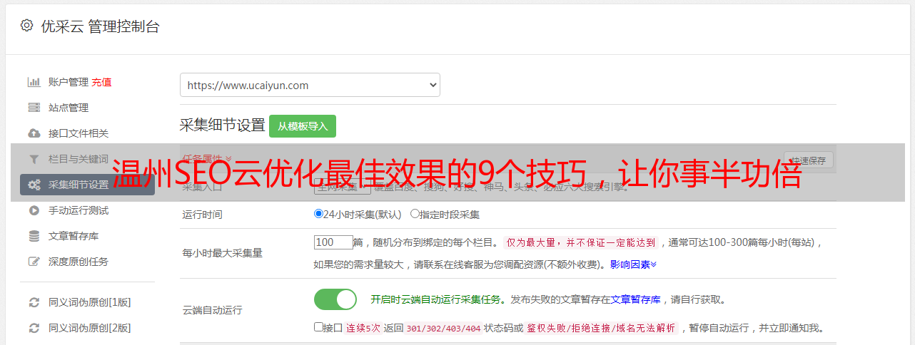 总之,在进行温州SEO云优化时需要综合考虑各种因素,并不断进行调整和改进,才能取得最佳效果。如果您需要专业的SEO服务支持,请联系我们:www.ucaiyun.com 。