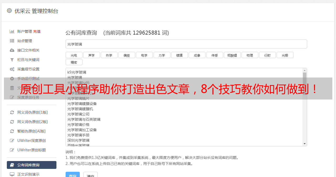 优采云 发布时间: 2023-03-05 04:07自媒体时代,让每个人都成为了一名作者、一名编辑。但是,如何让自己的文章更加出色?除了写作技巧,还有一个关键因素:原创工具小程序。这些小程序能够帮助你激发灵感,提高写作效率,让你的文章更加生动有趣。下面,我们将从8个方面逐步分析这些工具的使用方法和优势。