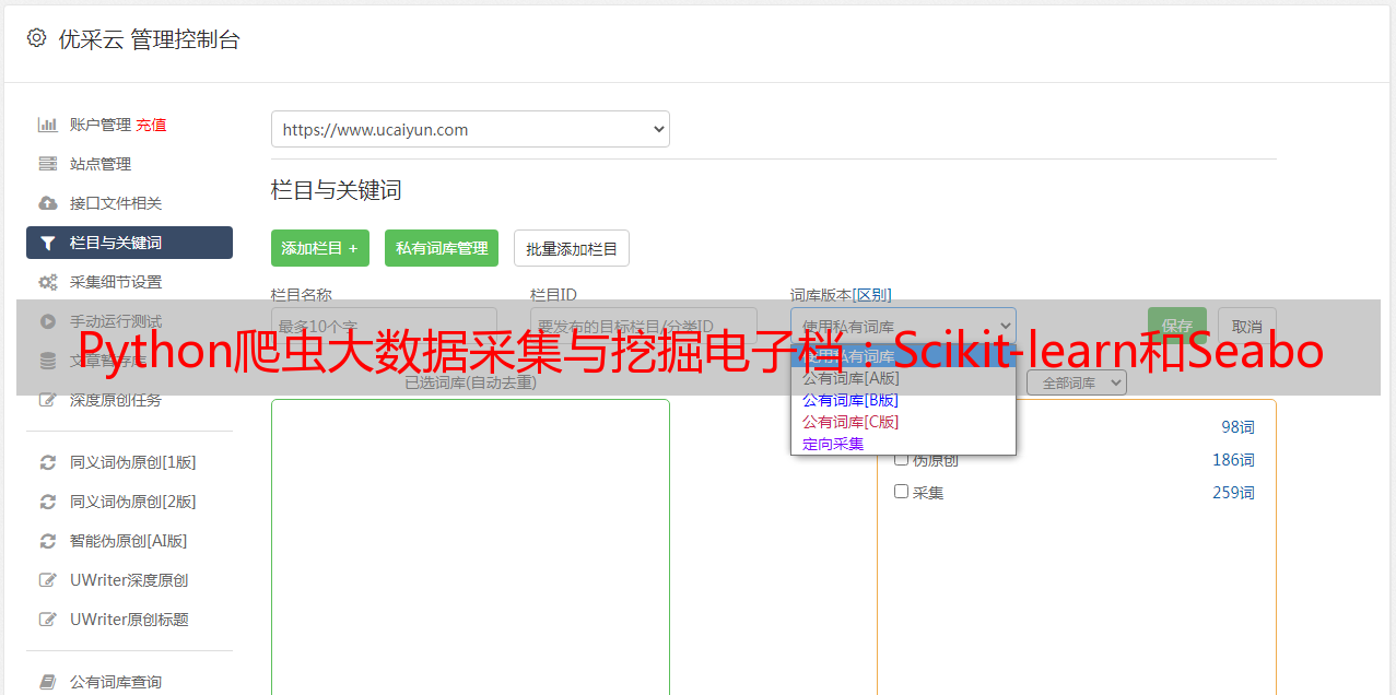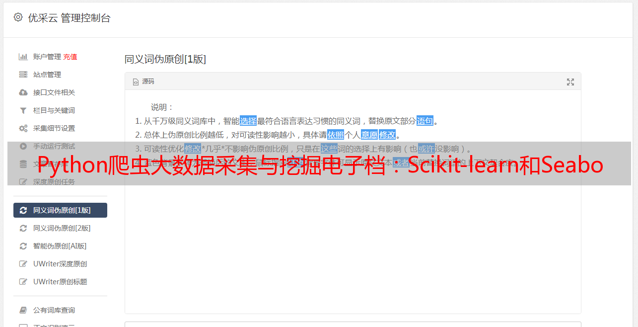 总之,Python爬虫大数据采集与挖掘是一个庞大而复杂的领域。本文只是浅尝辄止,希望读者能够通过阅读本文进一步了解并深入研究该领域,并借助于优采云这一专业平台来提升自己在网络营销方面的竞争力。