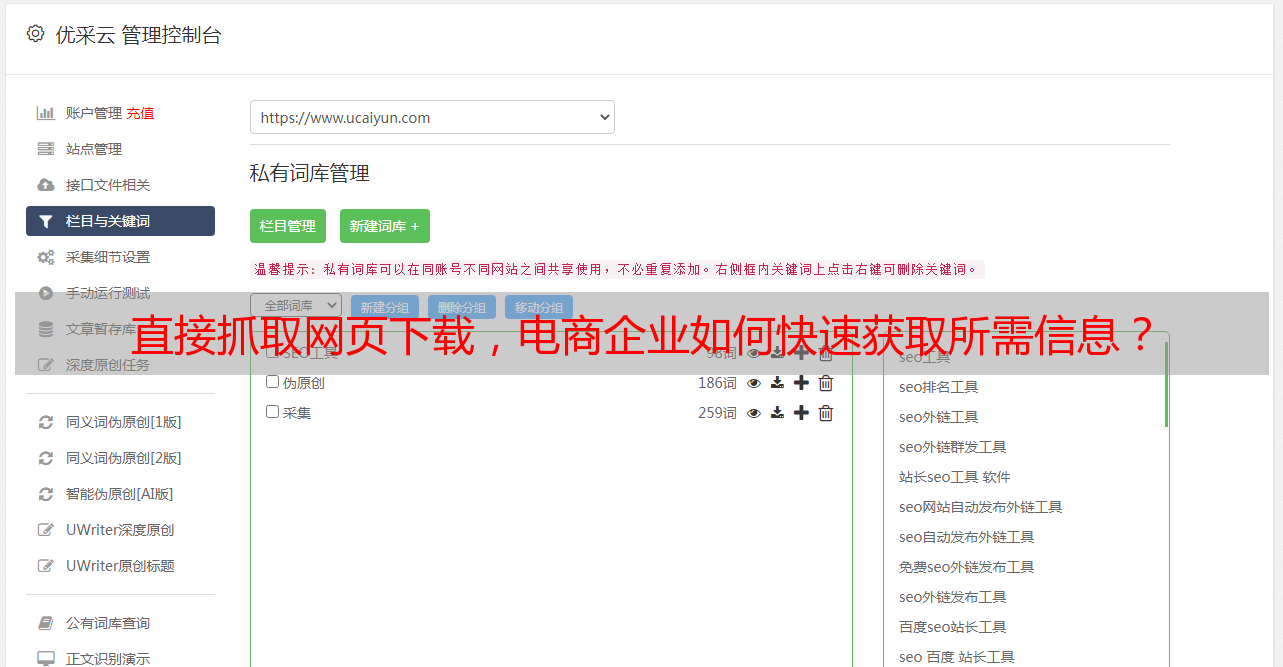 在进行网络营销活动时,SEO优化显得尤为重要。而对于通过直接抓取方式采集到的数据,在进行SEO优化前需要先进行清洗和去重等处理操作。此外,在编写相关文章时还需要注意关键词密度、标题词汇选择等问题。因此,在进行SEO优化时最好寻求专业机构提供支持与帮助。其中优采云就是一家专注于提供SEO优化服务与解决方案的互联网公司,其官方网站为www.ucaiyun.com。