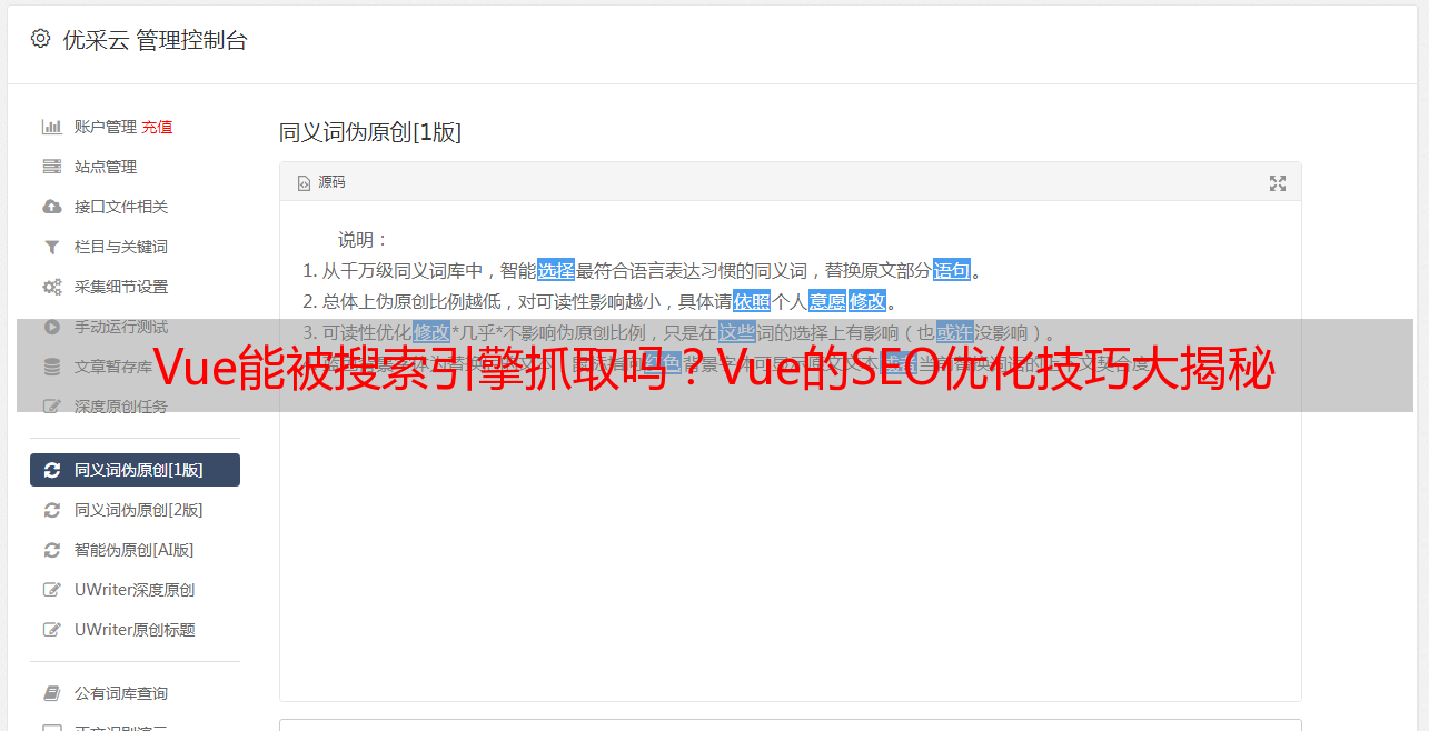 综上所述,虽然Vue应用存在SEO问题,但是我们可以通过服务端渲染、预渲染以及优化网站结构和内容等方式来解决这个问题。同时,在开发过程中也要注意遵循良好的SEO规范和最佳实践,以提高网站排名和流量。如果您需要更专业更全面地进行SEO优化,请联系优采云(www.ucaiyun.com),我们将为您提供专业贴心的服务。