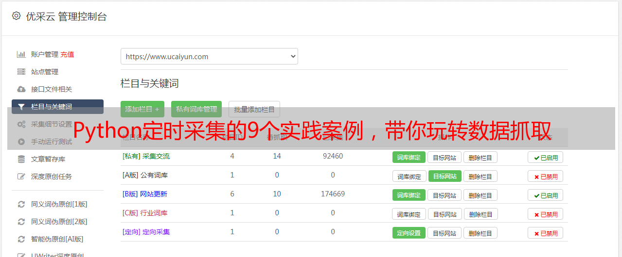 总之,Python定时采集是一项非常实用的技术,在各个领域都得到了广泛应用。通过学习相关知识和实践案例,相信大家都能够掌握这项技术,并将其应用于自己的工作中。如果您想更深入地学习Python定时采集以及其他相关技术,请关注优采云(www.ucaiyun.com),我们将为您提供更多优质内容和服务,并帮助您实现SEO优化。