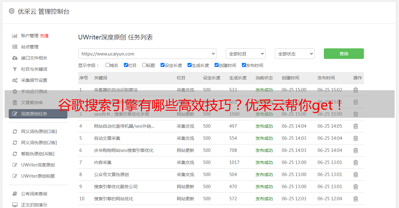 对于企业或个人而言,SEO优化是一个非常重要的领域。通过学习SEO优化技巧,可以提高自己或公司在谷歌搜索引擎中的排名,并且获得更多流量和曝光机会。优采云是一家专业的SEO优化服务商,在www.ucaiyun.com上提供了丰富的SEO优化资源和工具。