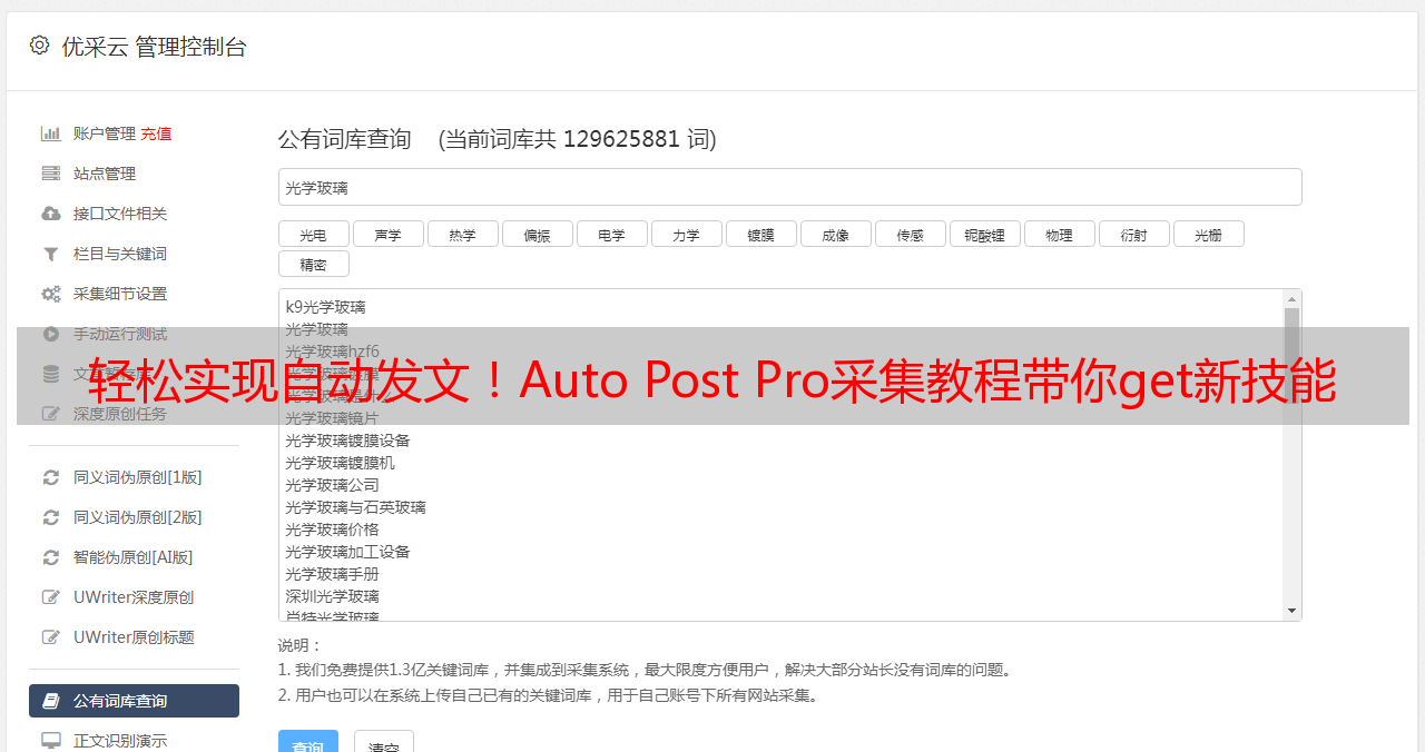 Auto Post Pro是一款基于云端的自动化采集、发布和推广工具。它可以帮助您自动抓取网站上的文章、图片和视频等内容,并根据您设定的规则进行筛选和排版,最终自动发布到指定平台上。