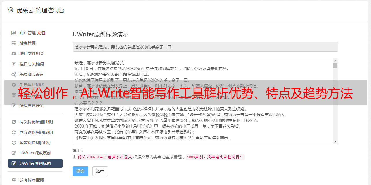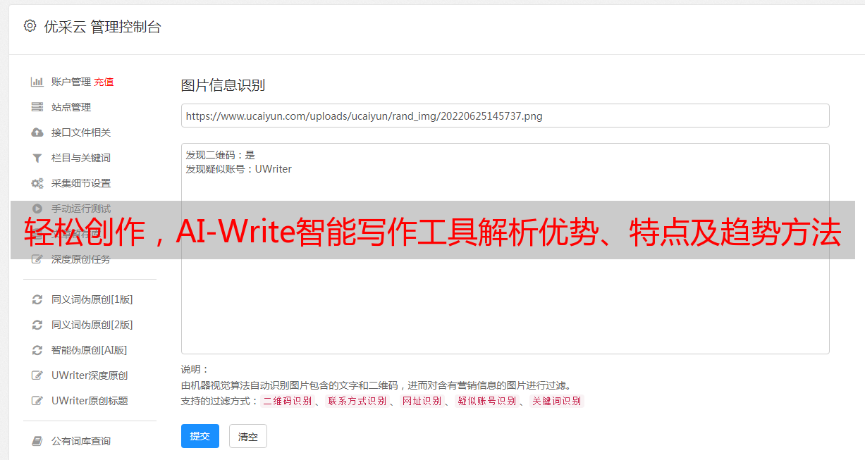 总之,AI-Write智能写作工具是一款功能强大、易于操作的写作辅助工具。如果您正在苦恼于文案撰写或者科技论文创作中遇到的问题,请尝试使用AI-Write吧!更多详情请访问优采云(www.ucaiyun.com),获取更好的SEO优化效果。