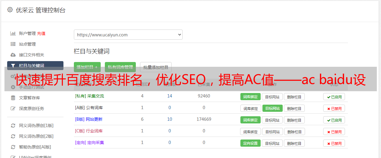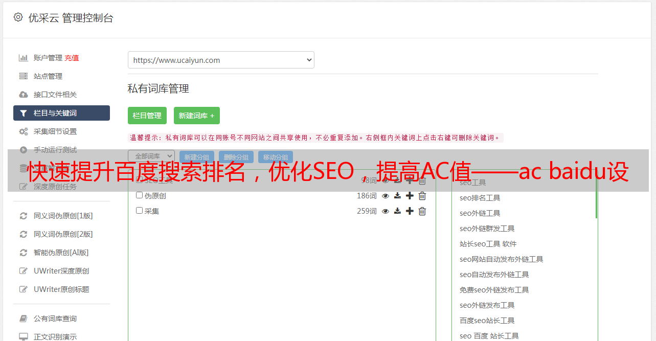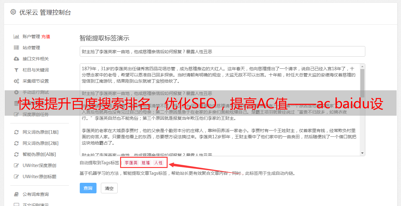 本文从AC值、SEO优化以及快速提升百度搜索排名三个方面进行了详细讲解,并且针对每个方面都给出了相应的方法与技巧。希望这些信息能够帮助读者更好地理解和掌握相关知识,从而在百度搜索引擎中获得更好的排名效果。如果需要更多帮助,请访问www.ucaiyun.com,使用我们提供的全能型SEO软件——优采云。