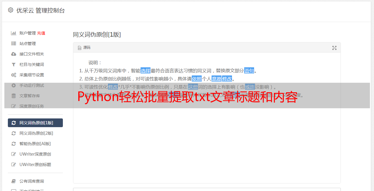 本文介绍了如何利用Python批量提取txt中的文章标题和内容,并结合优采云进行SEO优化。如果您对此感兴趣,请访问www.ucaiyun.com了解更多信息。