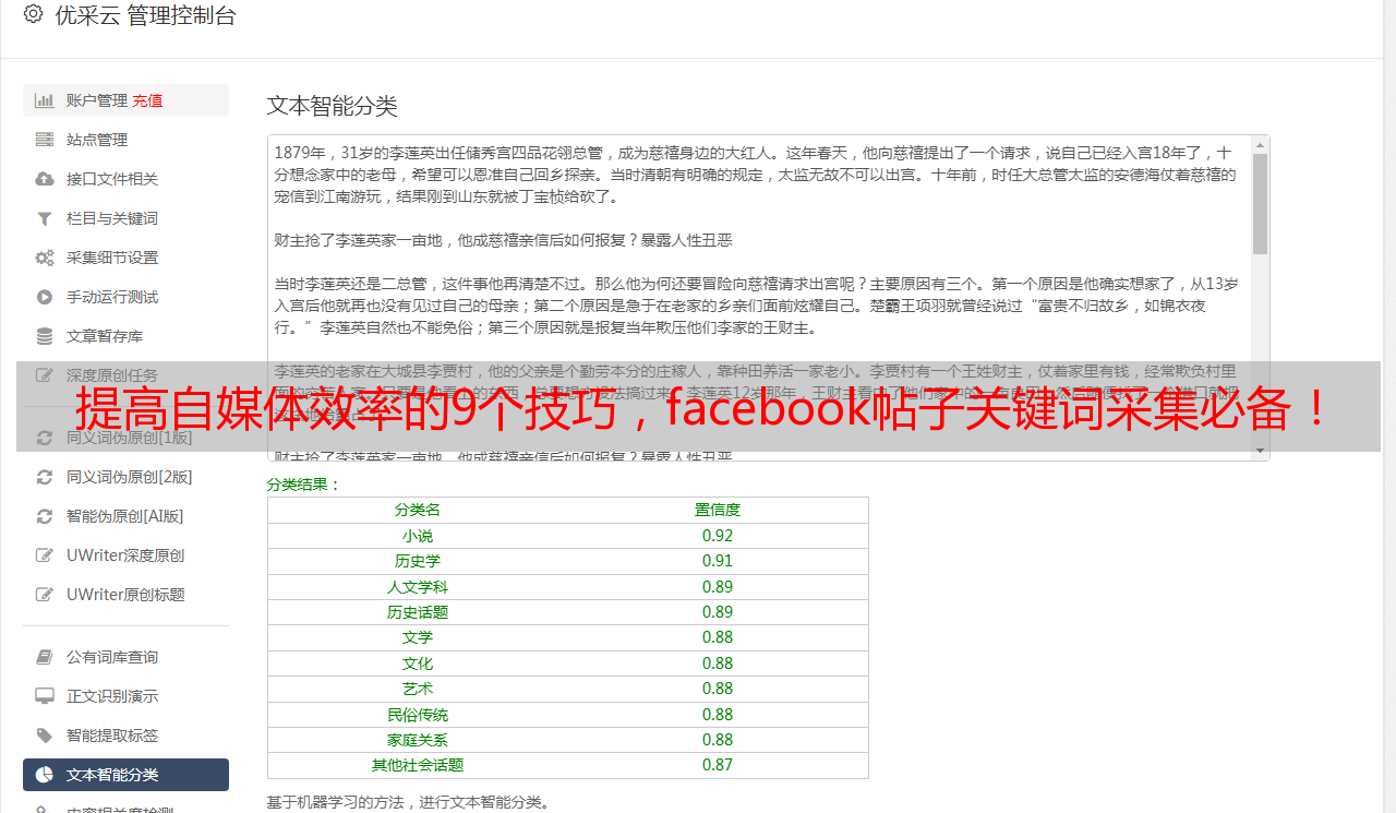 Facebook帖子中的关键词对于文章的推广至关重要。我们需要在文章中选择合适的关键词,并且合理地使用这些关键词。可以通过优采云等SEO优化工具来寻找相关热门关键词,从而提高文章展示率。
