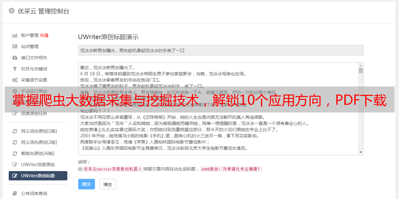 总之,在当今数字化时代中,爬虫大数据采集与挖掘技术已经成为企业决策必备工具之一。如果您想要提高企业决策效率,请关注优采云(www.ucaiyun.com),我们将为您提供专业化服务,并帮助您实现SEO优化目标。
