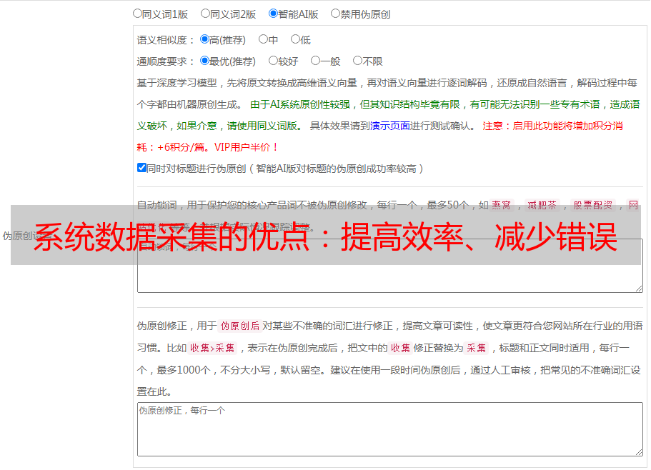 SEO(搜索引擎优化)是指通过一系列技术手段提升网站在搜索引擎结果页面(SERP)中排名的过程。而系统数据采集则是SEO优化中不可或缺的一环。它可以帮助网站收集关键词、链接等信息,并据此进行调整和优化。例如,在网站建设过程中使用优采云提供的SEO服务能够有效提升网站流量和转化率。
