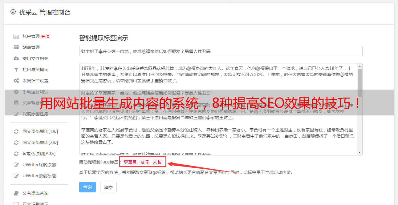 优采云 发布时间: 2023-03-06 08:11网站内容是吸引用户和搜索引擎的关键因素之一,但是对于许多网站管理员来说,不断更新、扩展和改进内容是一个耗时且繁琐的任务。在这种情况下,使用一个能够自动批量生成内容的系统就成为了一个非常有吸引力的选择。本文将介绍该系统的8个方面,以及如何使用它来提高你的网站的SEO效果。