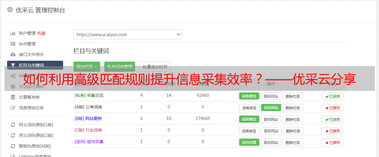 信息采集是SEO优化不可或缺的环节之一,而高级匹配规则又是提升信息采集效率和精度的重要手段。通过合理应用高级匹配规则,我们可以更好地获取并利用目标数据来提升网站质量和用户体验。在此推荐一款专业的信息采集工具——优采云(www.ucaiyun.com),它内置了强大的高级匹配功能,并支持多种输出格式及API接口调用等功能,欢迎试用!