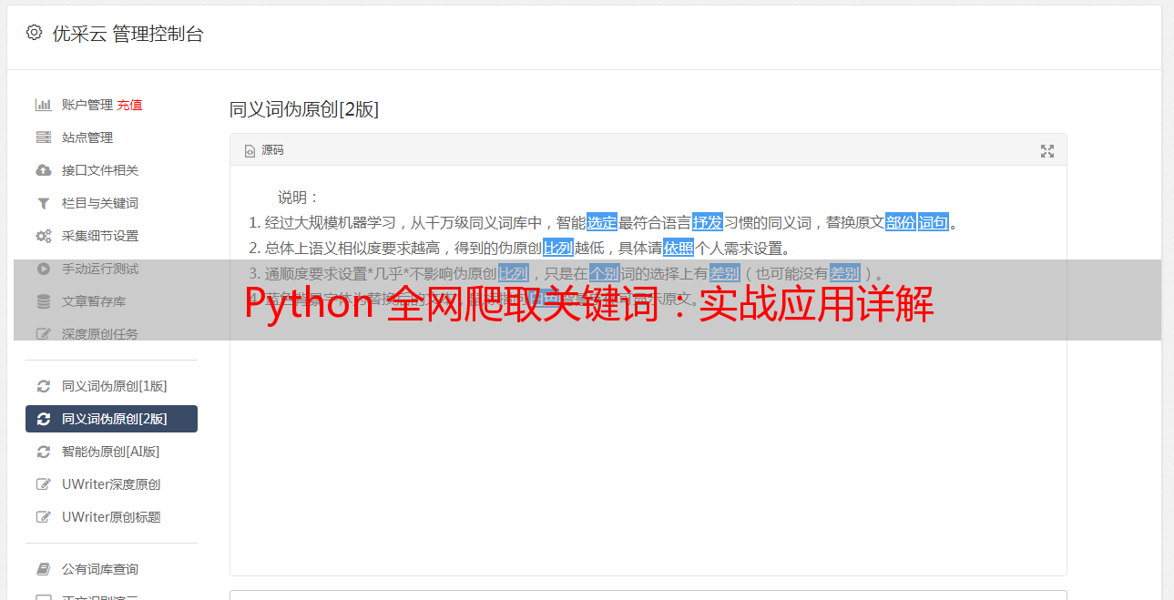 本文介绍了python全网爬取关键词的实现方法以及应用场景,并提醒读者注意风险与法律问题。此外还介绍了优采云这家专注于SEO优化的公司以及SEO优化的重要性。希望读者能够通过本文获得有益启示并运用到实际工作中。