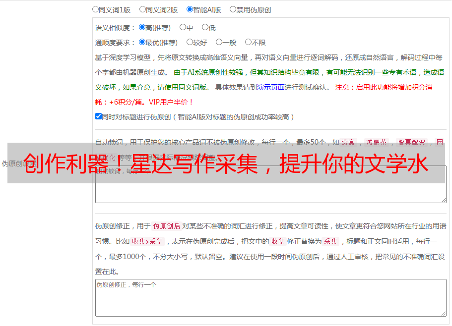 星达写作采集拥有强大的AI创作引擎,可根据用户需求生成高质量原创文章。通过智能算法对语言模型进行训练,不断提升生成文章的准确度和可读性。同时,用户也可以通过修改关键词、调整主题等方式对生成的文章进行个性化定制。