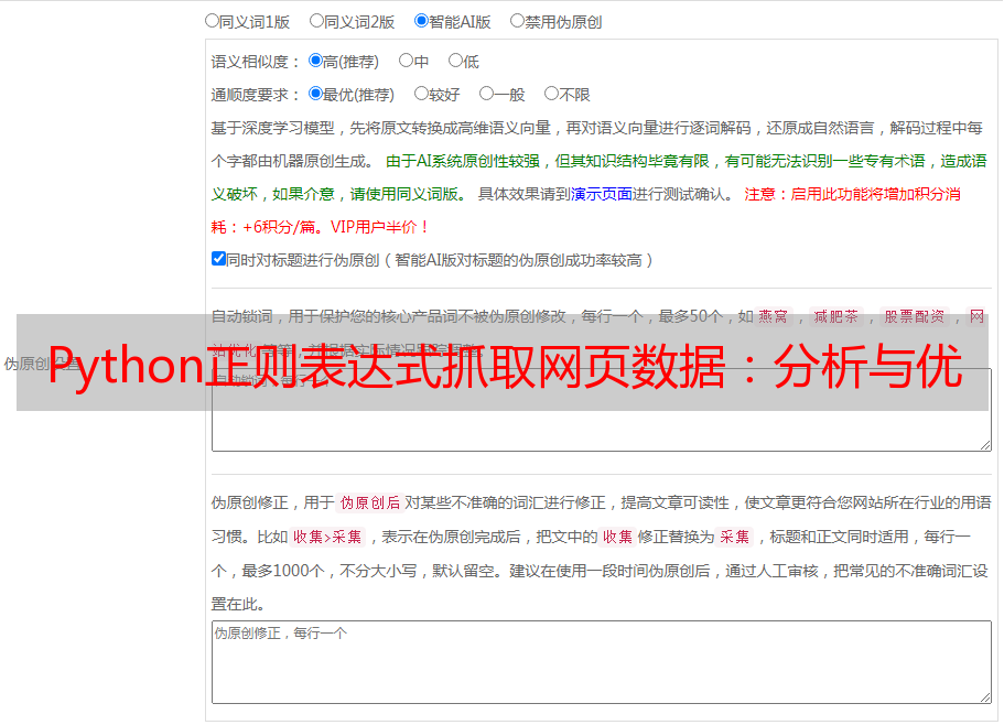优采云 发布时间: 2023-03-07 02:08Python正则表达式是一种强大的工具,它可以帮助你从网页中提取数据并进行分析。这篇文章将介绍如何使用Python正则表达式来抓取网页数据,以及如何使用这些数据来进行分析和优化。