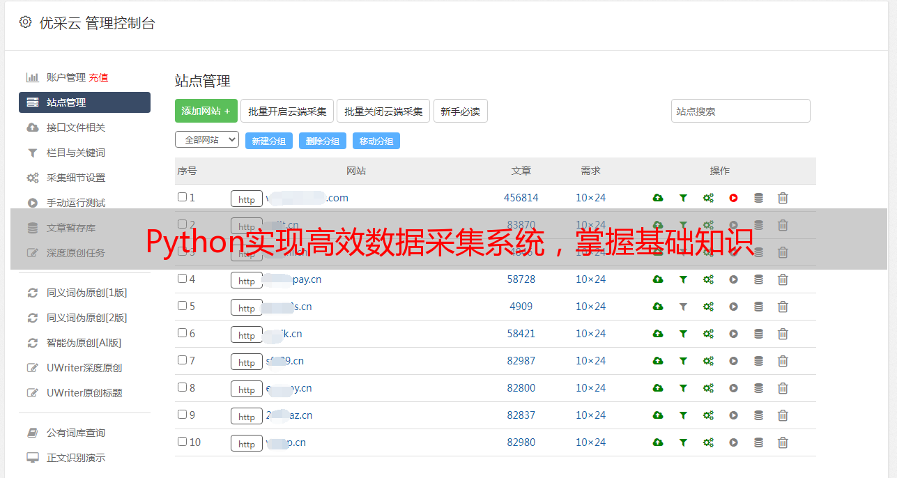 优采云 发布时间: 2023-03-07 09:17随着互联网信息的快速增长,数据采集已成为企业、研究机构和个人必备的技能。而爬虫技术是实现数据采集的重要手段之一。本文将从爬虫采集系统的基础知识、工具选择、编程语言、反爬策略、数据清洗、存储与分析等方面,为大家详细介绍如何用Python实现高效数据抓取。