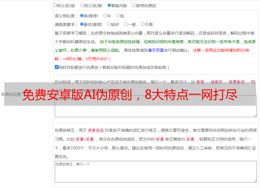 总之,通过本文对AI伪原创免费安卓版进行详细分析后我们可以得出一个结论:虽然存在一些缺点但是其优点明显并且越来越多企业或个人开始使用该软件。我们相信随着技术不断发展这个软件将会变得更加完善实用。最后值得提醒广大读者注意侵权问题,并且在使用过程中注意遵守相关法规。如果您想了解更多信息,请访问优采云(www.ucaiyun.com)。