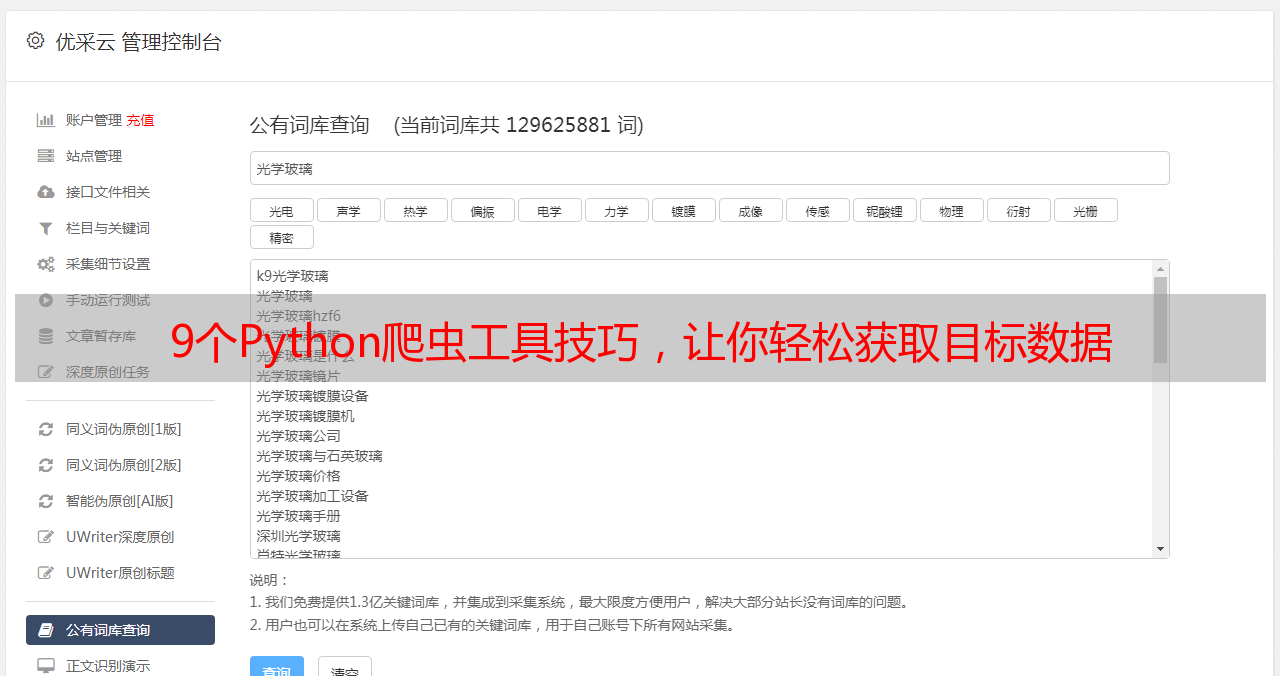优采云 发布时间: 2023-03-07 18:11Python爬虫工具是一个广泛使用的数据收集工具,它可以帮助你从各种网站上获取所需的数据。无论是分析竞争对手、跟踪趋势、还是收集市场信息,Python爬虫都可以帮助你完成任务。本文将详细介绍Python爬虫工具的9个方面,帮助你更好地了解这个强大的工具。