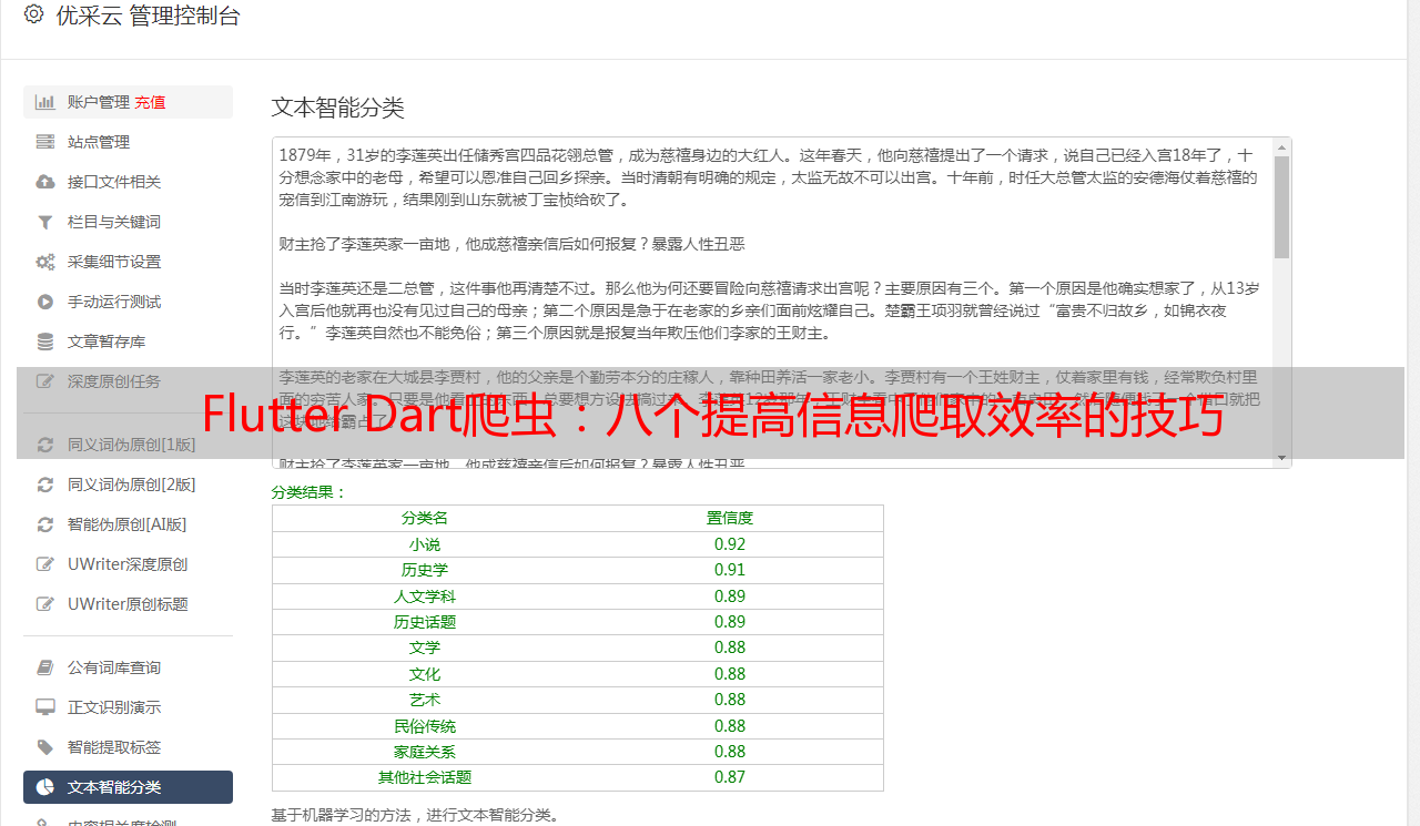 优采云 发布时间: 2023-03-08 12:11随着互联网时代的到来,信息的获取变得越来越容易。然而,在大量信息中找到有用的数据仍然是一项艰巨的任务。为了提高信息爬取效率,越来越多的人开始使用 Flutter 和 Dart 技术进行爬虫开发。本文将从以下八个方面详细介绍 Flutter Dart 爬虫的相关知识。