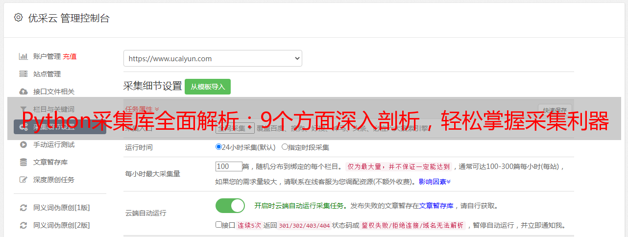 优采云 发布时间: 2023-03-08 12:11数据是21世纪最宝贵的资源之一,而数据采集是获取数据的重要手段。然而,数据采集往往需要大量的人力、物力和时间投入,而且难度较大。为了解决这个问题,Python 采集库应运而生。本文将从以下9个方面深入分析 Python 采集库,帮助读者更好地掌握这一利器。