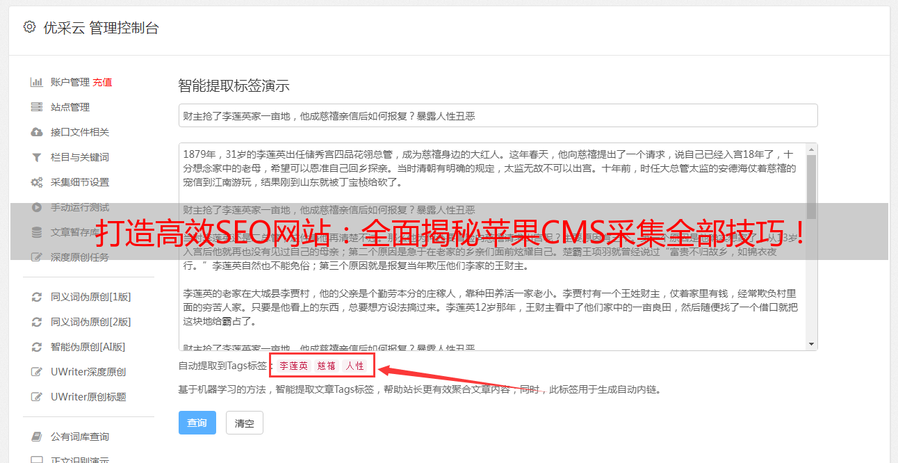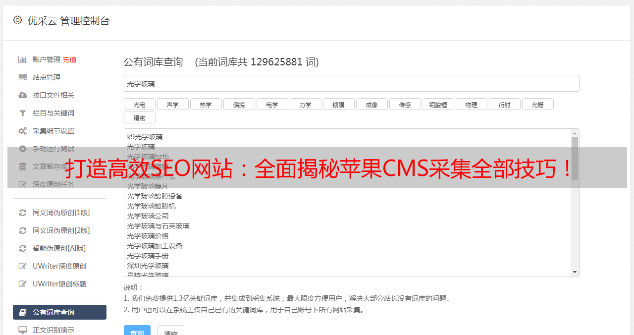 优采云 发布时间: 2023-03-08 14:14苹果CMS作为目前最受欢迎的开源CMS之一,其采集功能备受青睐。在SEO优化中,采集是一个非常重要的环节。本文将从苹果CMS采集全部的角度,探讨如何打造高效SEO网站。