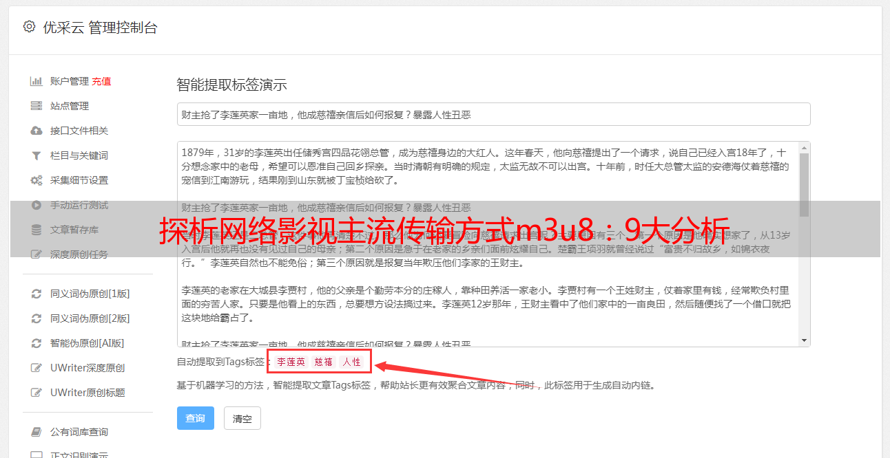 优采云 发布时间: 2023-03-08 20:11伴随着互联网信息时代的到来,网络影视已经成为了人们日常娱乐生活中不可或缺的一部分。在这个过程中,m3u8作为一种流媒体传输协议,正逐渐成为了网络影视传输的主流方式之一。而seacms m3u8则是其中应用最为广泛的一种方式,它将网络影视带入了一个全新的时代。本文将从以下9个方面逐步对seacms m3u8进行分析讨论。