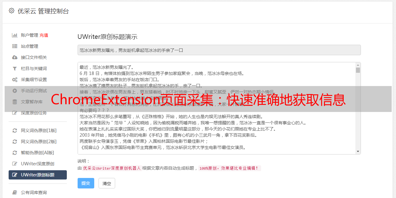 优采云是一款专业的数据分析与挖掘平台,在其平台上也提供了Chrome Extension页面采集工具。用户只需要安装该插件,并设置好相关规则即可快速地进行数据抓取和分析。同时,优采云还提供了图表分析、报表导出等多种功能,帮助用户更好地理解和利用所抓取的数据。