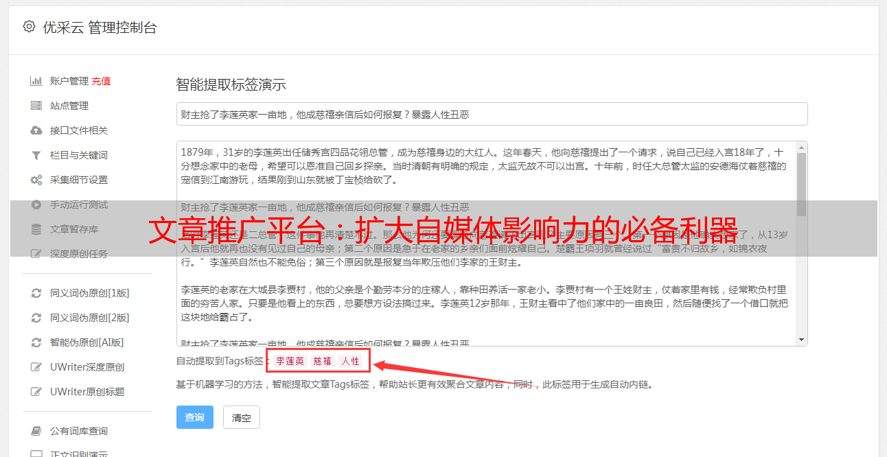 优采云 发布时间: 2023-03-09 01:08自媒体时代,内容创作者们都渴望将自己的作品传播到更广阔的范围,但如何扩大影响力呢?文章推广平台为你提供了一个全新的解决方案。本文将从8个方面详细分析这一平台的优势和使用方法。