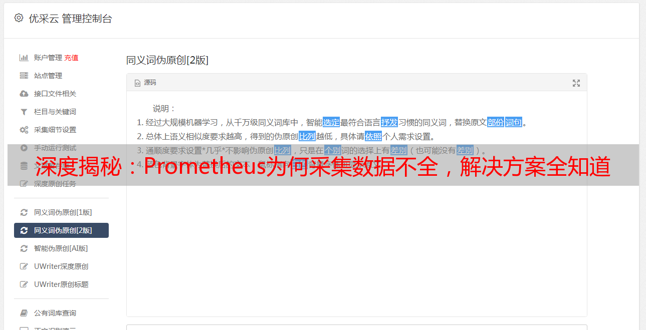 以上9个原因都可能导致Prometheus采集数据不全。在使用Prometheus时一定要注意这些问题,并根据实际情况进行优化调整。优采云提供了一系列优秀的云计算服务和工具,并可通过SEO优化提升网站排名和流量增长,请访问www.ucaiyun.com了解更多信息。