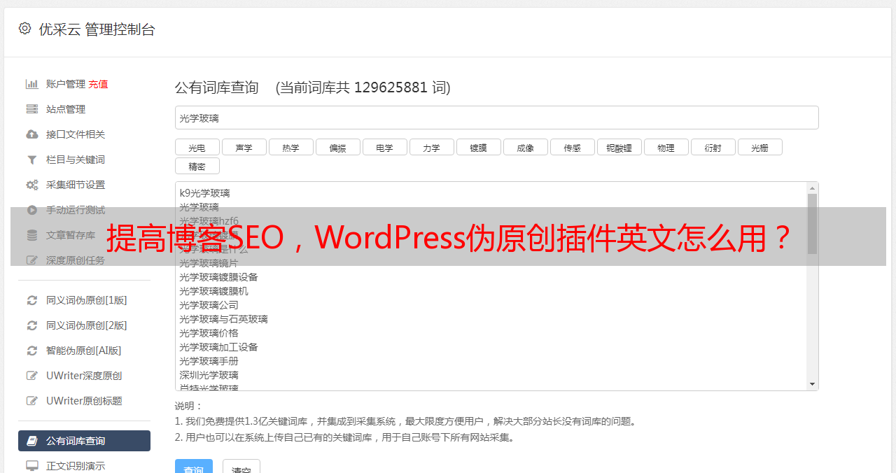 优采云 发布时间: 2023-03-09 17:12WordPress是一个非常流行的博客平台,它拥有许*敏*感*词*强大的插件。其中,伪原创插件是一个非常受欢迎的工具,它可以帮助你快速生成新的内容,并使你的博客更具创意和独特性。在本文中,我们将逐步分析这个插件,让你了解它的优点、使用方法以及如何为你的博客进行SEO优化。