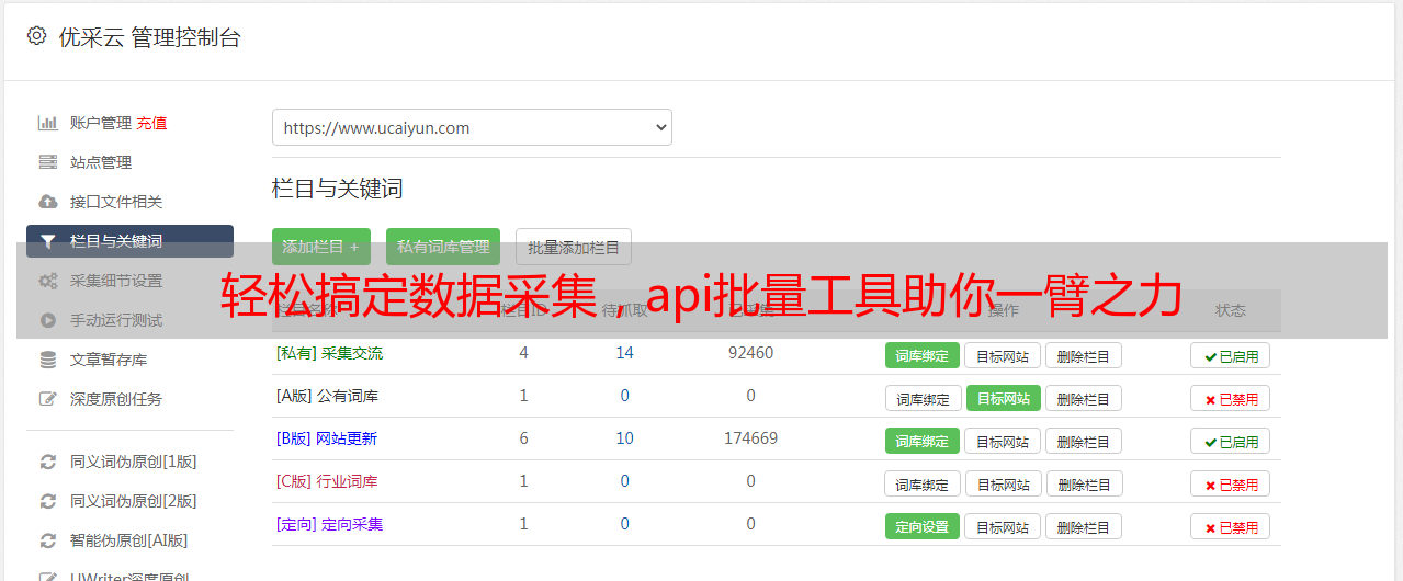 以上就是关于“通过api批量采集数据工具”的详细介绍。如果您需要了解更多相关内容,请访问优采云官网www.ucaiyun.com或直接联系我们。