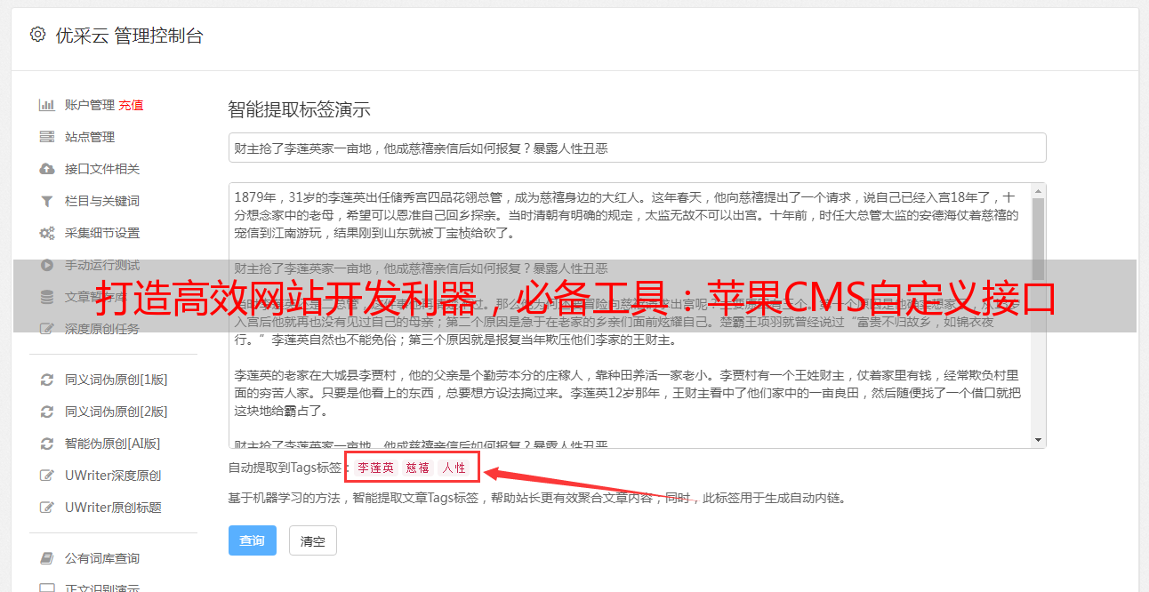 以优采云为例,在使用优采云进行SEO优化时,可以通过苹果CMS自定义接口实现与优采云之间的数据交互。具体实现步骤如下: