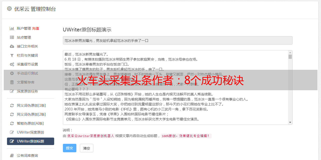 优采云 发布时间: 2023-03-10 10:15近年来,随着自媒体的兴起,越来越多的人开始尝试成为一名自媒体作者。其中,头条号是最受欢迎的自媒体平台之一。但是,如何在众多头条号中脱颖而出,成为一名成功的头条作者呢?这就需要我们学习和了解一些相关的知识和技巧。本文将从以下8个方面进行逐步分析讨论。