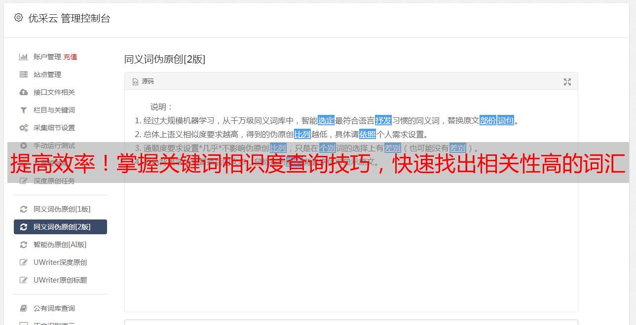 以上就是本文对于“关键词相似度计算”的详细分析和讨论。如果您想了解更多有关SEO优化技术或者优采云等SEO工具方面内容,请访问www.ucaiyun.com。