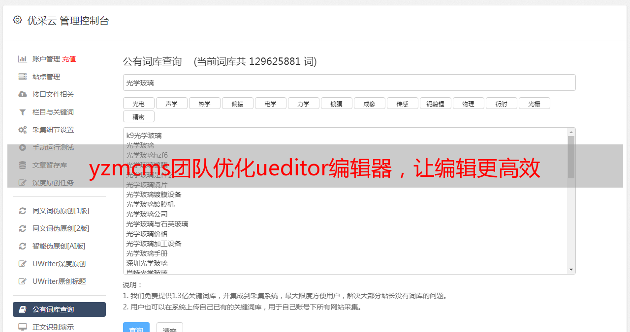 优采云 发布时间: 2023-03-11 09:17如今,随着互联网的快速发展,越来越多的人开始拥有自己的网站。作为一个网站管理员,我们需要经常更新网站内容,这就需要使用到一个好用的编辑器。而ueditor就是众多网站管理员的首选编辑器之一。然而,ueditor在一些方面还存在不足之处。于是,yzmcms开发团队对ueditor进行了改进和优化,使得它更加适合我们的使用。