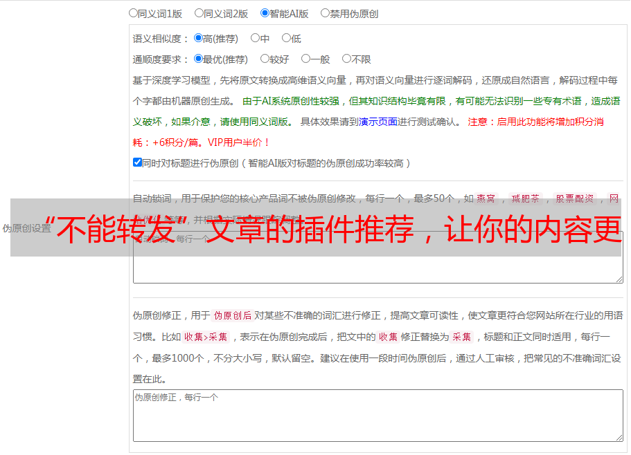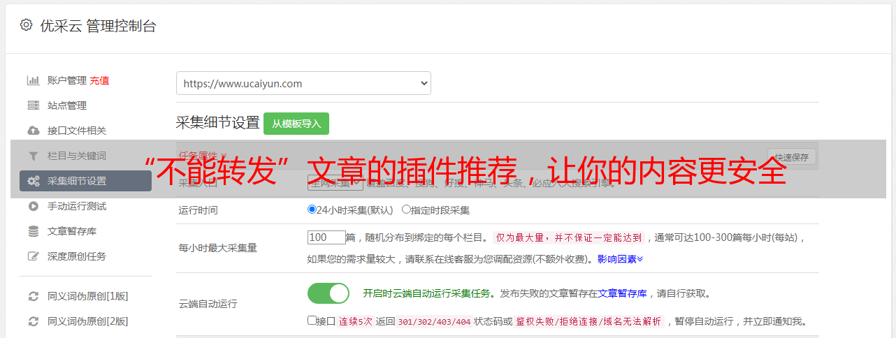 以上就是我介绍关于不能转发文章如何处理问题所需要使用到的插件和方法。通过限制复制、防盗链、加密、数字水印等方式来保护自己重要信息不被盗用,同时添加版权声明来提醒他人不要随意转载和分享。此外,在SEO优化方面也需要做好相应工作来提高网站排名和流量,并且联系专业公司如优采云来获取更好解决方案。