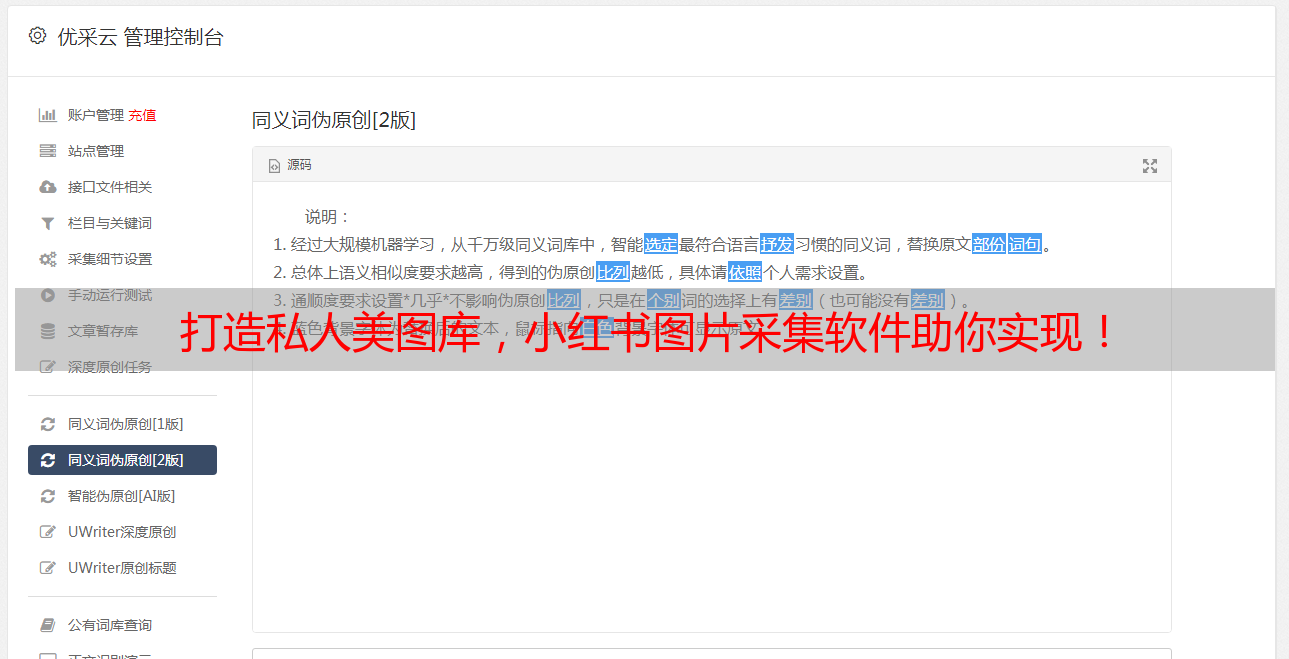 优采云 发布时间: 2023-03-12 05:07小红书作为时下最火的社交电商平台之一,其中精美的图片分享更是深受用户喜爱。但是,想要收集这些美图却并不容易。于是,小红书图片采集软件应运而生。今天我们就来深入了解这款软件,让你轻松打造自己的私人美图库。