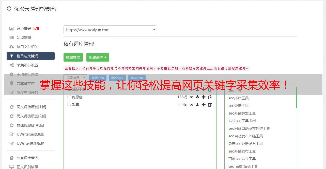 优采云 发布时间: 2023-03-12 10:18在如今这个信息爆炸的时代,网站的SEO优化已经成为了一个不可忽视的重要环节。而关键字采集则是SEO优化中不可或缺的一部分。通过对网页关键字进行采集,可以更加精准地定位目标用户,进而提升网站的排名和流量。本文将从多个方面对网页关键字采集进行详细讲解,帮助读者掌握这一必备技能。