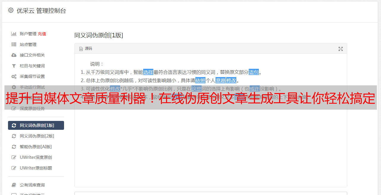 优采云 发布时间: 2023-03-12 20:15随着自媒体的兴起,越来越多的人开始涉足这个领域。然而,面对内容的竞争,如何让自己的文章在众多内容中脱颖而出,成为每个自媒体人需要思考的问题。今天介绍一种在线伪原创文章生成工具,可以帮助自媒体人快速提升文章质量。